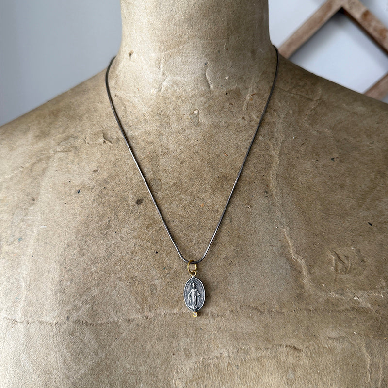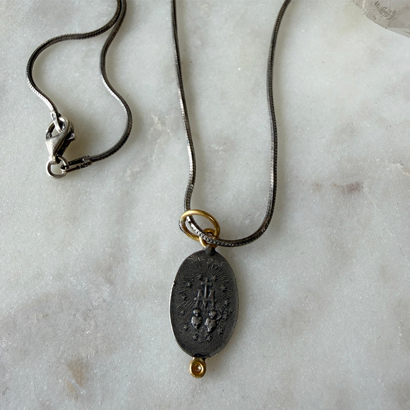 The dark color of oxidized sterling silver is a special treatment that is achieved by careful processing at our design studio. With time and with wear, the color of the oxidized metal may lighten a bit--this is a natural and organic occurrence. Please do not clean oxidized sterling silver jewelry.  Attempting to clean oxidized sterling silver jewelry will remove the finish.