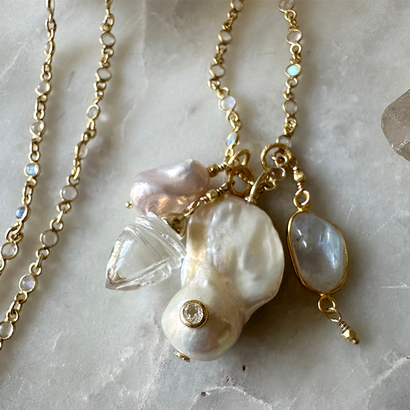 - Moonstone, freshwater pearl, quartz