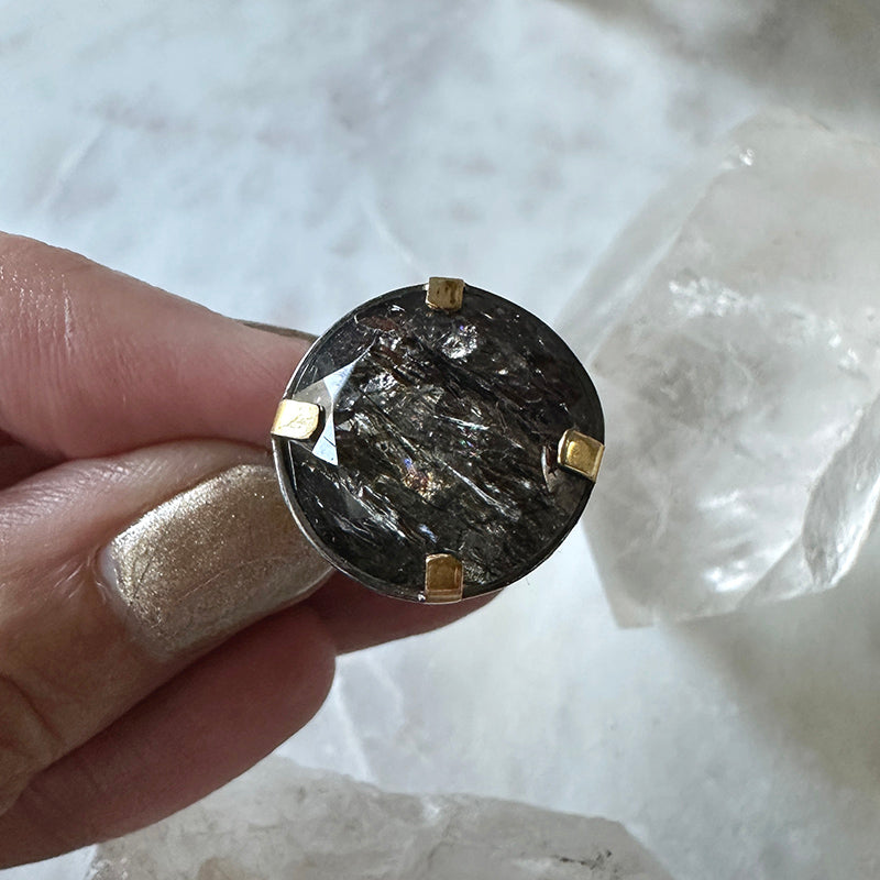 The dark color of oxidized sterling silver is a special treatment that is achieved by careful processing at our design studio. With time and with wear, the color of the oxidized metal may lighten a bit--this is a natural and organic occurrence. Please do not clean oxidized sterling silver jewelry. Attempting to clean oxidized sterling silver jewelry will remove the finish.