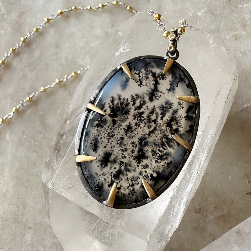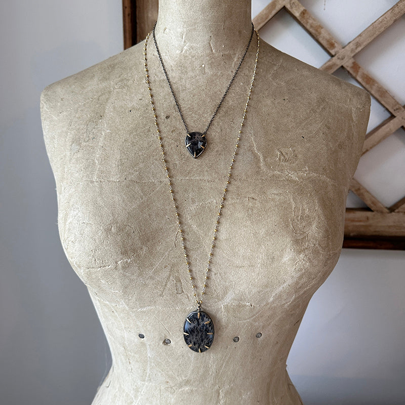 The dark color of oxidized sterling silver is a special treatment that is achieved by careful processing at our design studio. With time and with wear, the color of the oxidized metal may lighten a bit--this is a natural and organic occurrence. Please do not clean oxidized sterling silver jewelry. Attempting to clean oxidized sterling silver jewelry will remove the finish.