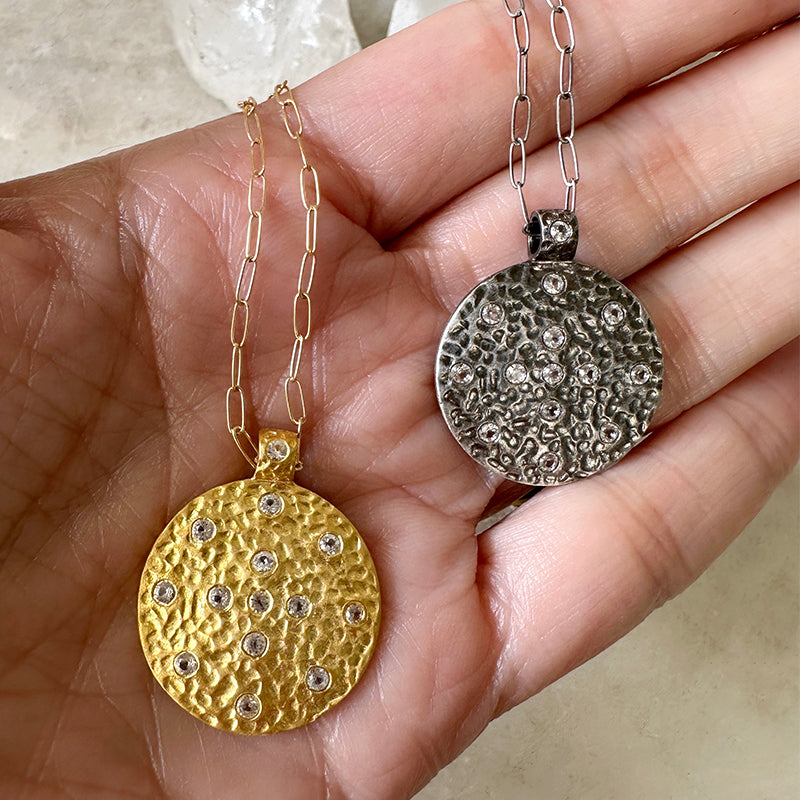 The dark color of oxidized sterling silver is a special treatment that is achieved by careful processing at our design studio. With time and with wear, the color of the oxidized metal may lighten a bit--this is a natural and organic occurrence. Please do not clean oxidized sterling silver jewelry. Attempting to clean oxidized sterling silver jewelry will remove the finish.